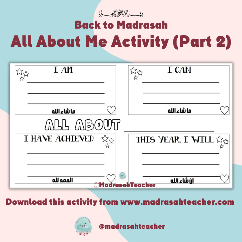 This is another “All About Me” activity that I like doing with my classes at the beginning of the Madrasah year. It can be done after a few days of Madrasah have passed, and you’d like for them to open up and gain insight into who they actually are.